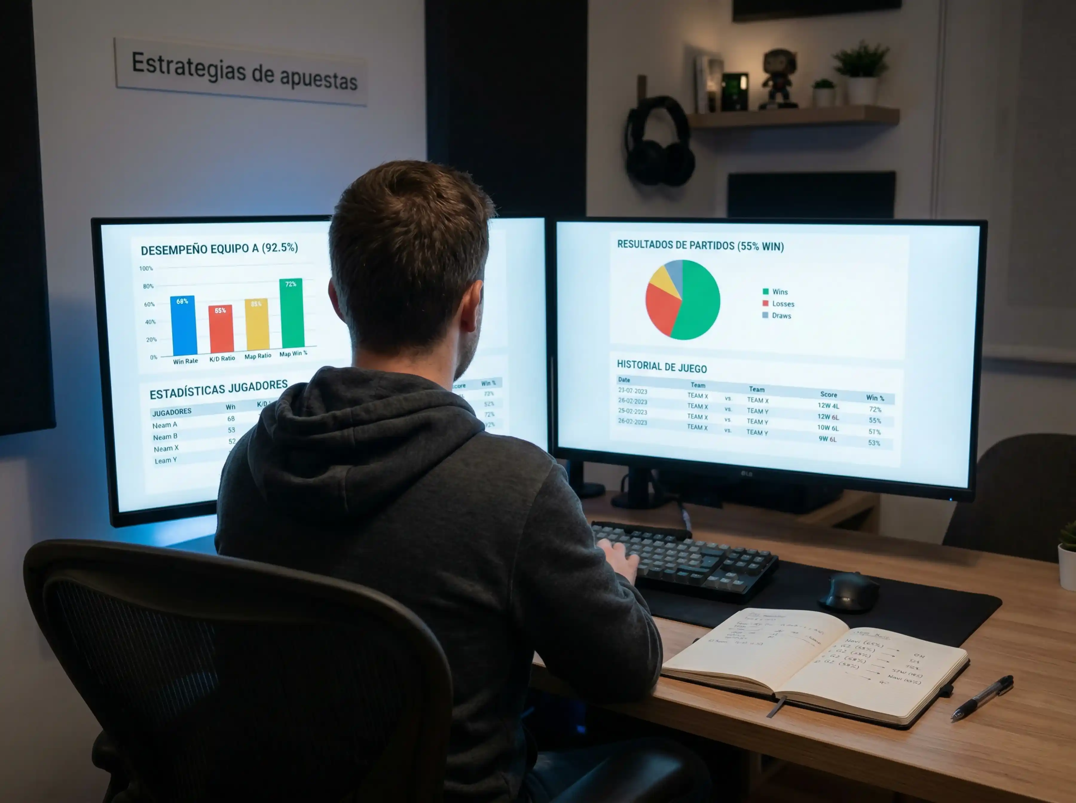 Escritorio con monitor mostrando estadisticas de equipos de League of Legends y notas de analisis